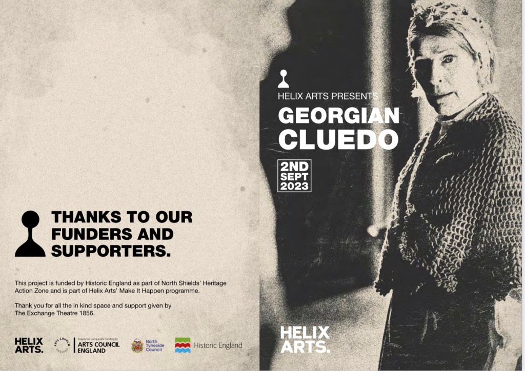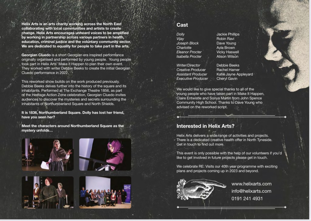 Georgian Cluedo is a short Georgian era inspired performance originally organised and performed by young people. Young people took part in Helix Arts’ Make it Happen to plan their own event. They worked with writer Debbie Beeks to create the initial Georgian Cluedo performance in December 2022.