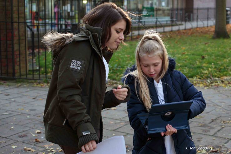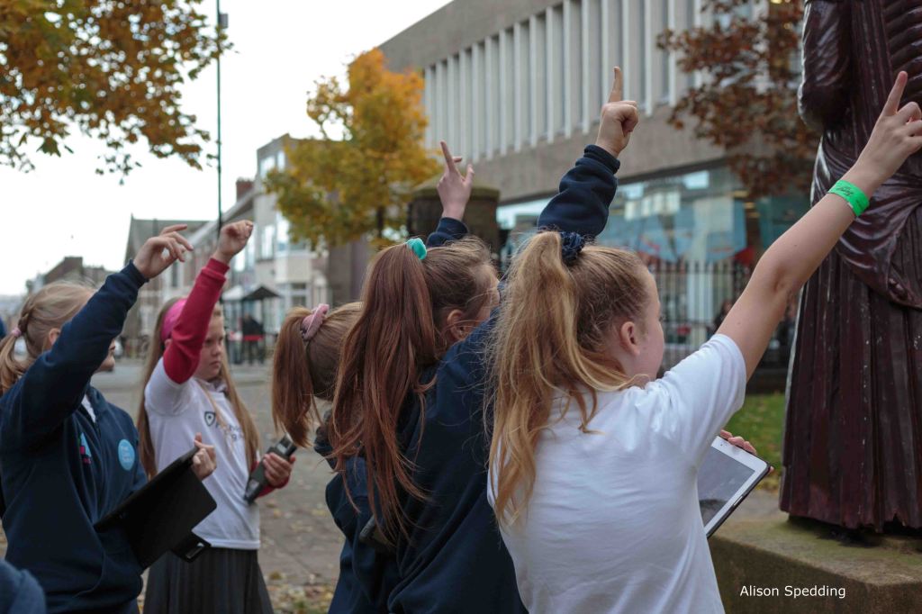 Schoolgirls used I-pads to capture 2D images to create a 3D model of the Wooden Dolly in Northumberland Square.